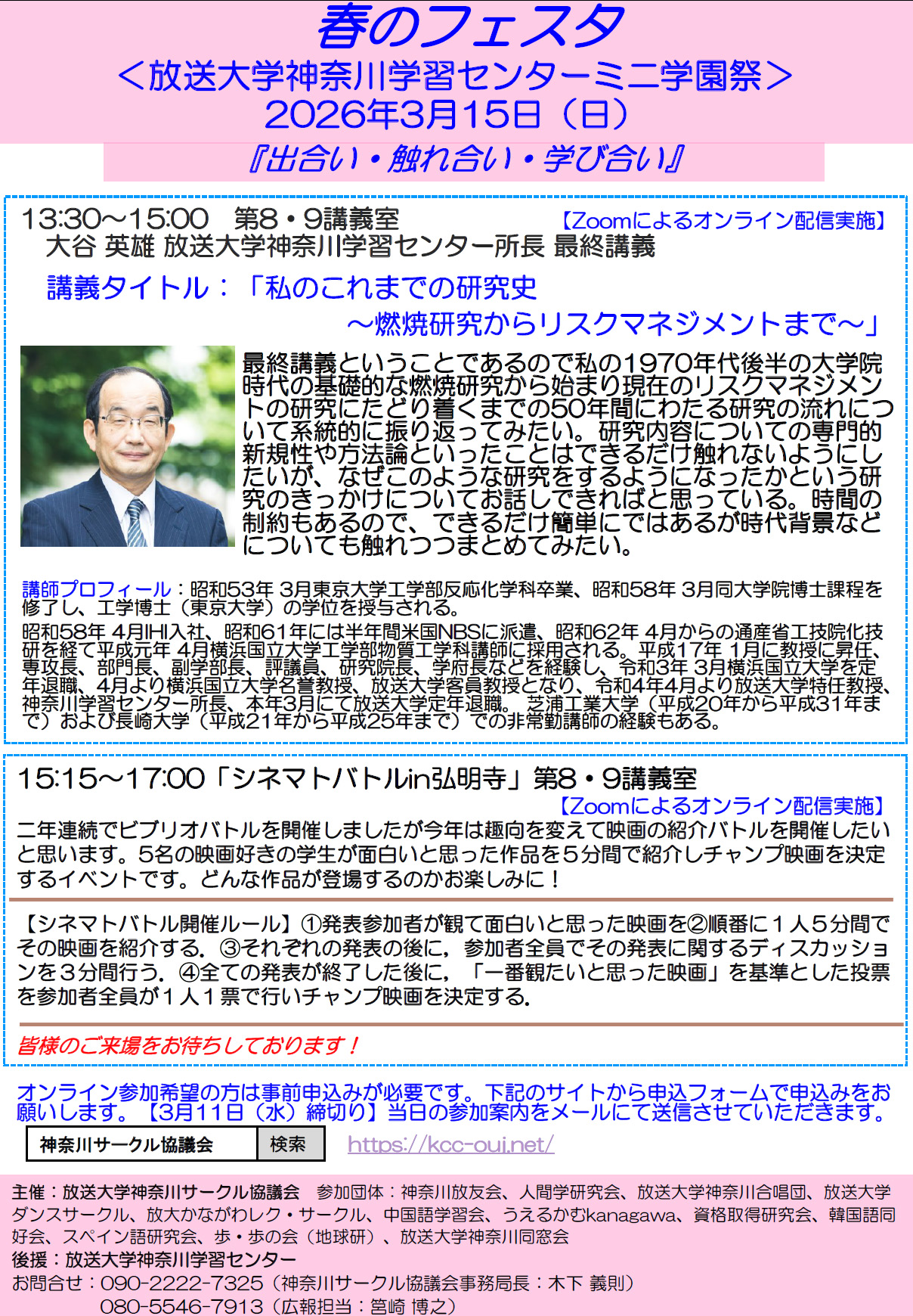 2026年春のフェスタ2026年3月15日(日)放送大学神奈川学習センターにてZoom参加要事前申し込みお申し込みは、こちら